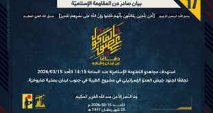 بِسْمِ اللَّـهِ الرحمن الرَّحِيمِ ﴿أُذِنَ لِلَّذِينَ يُقَاتَلُونَ بِأَنَّهُمْ ظُلِمُوا وَإِنَّ اللَّهَ عَلَىٰ نَصْرِهِمْ لَقَدِيرٌ﴾ صَدَقَ اللهُ العَلِيّ العَظِيم دفاعًا عن لبنان وشعبه، وفي إطار التحذير الذي وجّهته المُقاومة الإسلاميّة لعددٍ من مستوطنات شمال فلسطين المحتلّة، استهدف مجاهدو المُقاومة الإسلاميّة عند الساعة 17:00 الأحد 15/03/2026 مستوطنة أفيفيم بصلية صاروخيّة. ﴿وَمَا النَّصْرُ إِلاَّ مِنْ عِندِ اللّهِ الْعَزِيزِ الْحَكِيم﴾ الأحد 15-03-2026 25 رمضان …