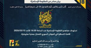 بِسْمِ اللَّـهِ الرحمن الرَّحِيمِ ﴿أُذِنَ لِلَّذِينَ يُقَاتَلُونَ بِأَنَّهُمْ ظُلِمُوا وَإِنَّ اللَّهَ عَلَىٰ نَصْرِهِمْ لَقَدِيرٌ﴾ صَدَقَ اللهُ العَلِيّ العَظِيم دفاعًا عن لبنان وشعبه، استهدف مجاهدو المُقاومة الإسلاميّة عند الساعة 17:00 الأحد 15/03/2026 تجمّعًا لآليات وجنود جيش العدوّ الإسرائيليّ عند تلة الخزان في بلدة العديسة عند الحدود اللبنانية الفلسطينية بقذائف المدفعيّة. ﴿وَمَا النَّصْرُ إِلاَّ مِنْ عِندِ اللّهِ الْعَزِيزِ الْحَكِيم﴾ الأحد 15-03-2026 25 …