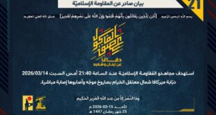 بِسْمِ اللَّـهِ الرحمن الرَّحِيمِ ﴿أُذِنَ لِلَّذِينَ يُقَاتَلُونَ بِأَنَّهُمْ ظُلِمُوا وَإِنَّ اللَّهَ عَلَىٰ نَصْرِهِمْ لَقَدِيرٌ﴾ صَدَقَ اللهُ العَلِيّ العَظِيم دفاعًا عن لبنان وشعبه، استهدف مجاهدو المُقاومة الإسلاميّة عند الساعة 21:40 أمس السبت 14/03/2026 دبّابة ميركافا شمال معتقل الخيام بصاروخ موجّه وأصابوها إصابة مباشرة. ﴿وَمَا النَّصْرُ إِلاَّ مِنْ عِندِ اللّهِ الْعَزِيزِ الْحَكِيم﴾ الأحد 15-03-2026 25 رمضان 1447 هـ