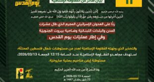بِسْمِ اللَّـهِ الرحمن الرَّحِيمِ ﴿أُذِنَ لِلَّذِينَ يُقَاتَلُونَ بِأَنَّهُمْ ظُلِمُوا وَإِنَّ اللَّهَ عَلَىٰ نَصْرِهِمْ لَقَدِيرٌ الَّذِينَ أُخْرِجُوا مِن دِيَارِهِم بِغَيْرِ حَقٍّ إِلَّا أَن يَقُولُوا رَبُّنَا اللَّهُ﴾ صَدَقَ اللهُ العَلِيّ العَظِيم ردًّا على العدوان الإسرائيلي المجرم الذي طال عشرات المدن والبلدات اللبنانيّة وضاحية بيروت الجنوبيّة، وفي إطار عمليّات يوم القدس، استهدف مجاهدو المُقاومة الإسلاميّة عند الساعة 13:30 الجمعة 13/03/2026، تجمّع جنود لجيش …