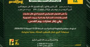 بِسْمِ اللَّـهِ الرحمن الرَّحِيمِ ﴿أُذِنَ لِلَّذِينَ يُقَاتَلُونَ بِأَنَّهُمْ ظُلِمُوا وَإِنَّ اللَّهَ عَلَىٰ نَصْرِهِمْ لَقَدِيرٌ الَّذِينَ أُخْرِجُوا مِن دِيَارِهِم بِغَيْرِ حَقٍّ إِلَّا أَن يَقُولُوا رَبُّنَا اللَّهُ﴾ صَدَقَ اللهُ العَلِيّ العَظِيم ردًّا على العدوان الإسرائيلي المجرم الذي طال عشرات المدن والبلدات اللبنانيّة وضاحية بيروت الجنوبيّة، وفي إطار عمليّات يوم القدس، استهدف مجاهدو المُقاومة الإسلاميّة عند الساعة 12:15 الجمعة 13/03/2026، قاعدة ميرون للمراقبة …