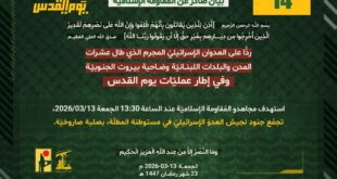 بِسْمِ اللَّـهِ الرحمن الرَّحِيمِ ﴿أُذِنَ لِلَّذِينَ يُقَاتَلُونَ بِأَنَّهُمْ ظُلِمُوا وَإِنَّ اللَّهَ عَلَىٰ نَصْرِهِمْ لَقَدِيرٌ الَّذِينَ أُخْرِجُوا مِن دِيَارِهِم بِغَيْرِ حَقٍّ إِلَّا أَن يَقُولُوا رَبُّنَا اللَّهُ﴾ صَدَقَ اللهُ العَلِيّ العَظِيم ردًّا على العدوان الإسرائيلي المجرم الذي طال عشرات المدن والبلدات اللبنانيّة وضاحية بيروت الجنوبيّة، وفي إطار عمليّات يوم القدس، استهدف مجاهدو المُقاومة الإسلاميّة عند الساعة 13:00 الجمعة 13/03/2026، تجمّع جنود لجيش …