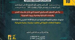 بِسْمِ اللَّـهِ الرحمن الرَّحِيمِ ﴿وَأَرْسَلَ عَلَيْهِمْ طَيْرًا أَبَابِيلَ تَرْمِيهِم بِحِجَارَةٍ مِّن سِجِّيلٍ فَجَعَلَهُمْ كَعَصْفٍ مَّأْكُولٍ﴾ صَدَقَ اللهُ العَلِيّ العَظِيم ردًّا على العدوان الإسرائيلي المجرم الذي طال عشرات المدن والبلدات اللبنانيّة وضاحية بيروت الجنوبيّة، استهدف مجاهدو المُقاومة الإسلاميّة عند الساعة 05:15 أمس الأربعاء 11/03/2026، قاعدة ميرون للمراقبة وإدارة العمليات الجوية شمال فلسطين المحتلة بسربٍ من المُسيّرات الانقضاضيّة وأسفرت العملية عن إصابة …