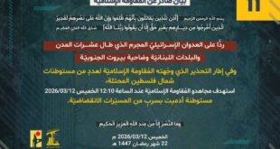 بِسْمِ اللَّـهِ الرحمن الرَّحِيمِ ﴿أُذِنَ لِلَّذِينَ يُقَاتَلُونَ بِأَنَّهُمْ ظُلِمُوا وَإِنَّ اللَّهَ عَلَىٰ نَصْرِهِمْ لَقَدِيرٌ الَّذِينَ أُخْرِجُوا مِن دِيَارِهِم بِغَيْرِ حَقٍّ إِلَّا أَن يَقُولُوا رَبُّنَا اللَّهُ﴾ صَدَقَ اللهُ العَلِيّ العَظِيم ردًّا على العدوان الإسرائيلي المجرم الذي طال عشرات المدن والبلدات اللبنانيّة وضاحية بيروت الجنوبيّة، استهدف مجاهدو المُقاومة الإسلاميّة عند الساعة 06:00 الخميس 12/03/2026، منظومة الدفاعات الجويّة المحيطة بمدينة قيسارية المحتلّة، بصلية …