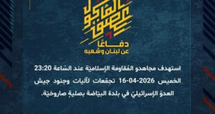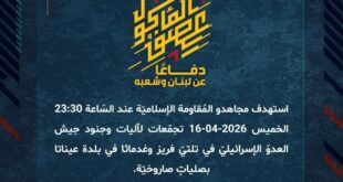بِسْمِ اللَّـهِ الرحمن الرَّحِيمِ ﴿أُذِنَ لِلَّذِينَ يُقَاتَلُونَ بِأَنَّهُمْ ظُلِمُوا وَإِنَّ اللَّهَ عَلَىٰ نَصْرِهِمْ لَقَدِيرٌ﴾ صَدَقَ اللهُ العَلِيّ العَظِيم دفاعًا عن لبنان وشعبه، وردًّا على خرق العدوّ لاتفاق وقف إطلاق النار، واعتداءاته المتكرّرة على قرى ومدن الجنوب، وبعدما التزمت المقاومة بوقف النار ولم يلتزم به العدوّ، استهدف مجاهدو المُقاومة الإسلاميّة عند السّاعة 23:25 الخميس 16-04-2026 قاعدة شراغا (المقرّ الإداريّ لقيادة لواء …