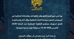 بِسْمِ اللَّـهِ الرحمن الرَّحِيمِ ﴿أُذِنَ لِلَّذِينَ يُقَاتَلُونَ بِأَنَّهُمْ ظُلِمُوا وَإِنَّ اللَّهَ عَلَىٰ نَصْرِهِمْ لَقَدِيرٌ﴾ صَدَقَ اللهُ العَلِيّ العَظِيم دفاعًا عن لبنان وشعبه، وردًّا على خرق العدوّ لاتفاق وقف إطلاق النار، واعتداءاته المتكرّرة على قرى ومدن الجنوب، وبعدما التزمت المقاومة بوقف النار ولم يلتزم به العدوّ، استهدف مجاهدو المُقاومة الإسلاميّة عند السّاعة 23:30 الخميس 16-04-2026 مستوطنة نهاريا بصليةٍ صاروخيّة. ﴿وَمَا النَّصْرُ …