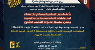 بِسْمِ اللَّـهِ الرحمن الرَّحِيمِ ﴿وَأَرْسَلَ عَلَيْهِمْ طَيْرًا أَبَابِيلَ تَرْمِيهِم بِحِجَارَةٍ مِّن سِجِّيلٍ فَجَعَلَهُمْ كَعَصْفٍ مَّأْكُولٍ﴾ صَدَقَ اللهُ العَلِيّ العَظِيم ردًّا على العدوان الإسرائيلي المجرم الذي طال عشرات المدن والبلدات اللبنانيّة وضاحية بيروت الجنوبيّة، وضمن سلسلة عمليّات العصف المأكول، استهدف مجاهدو المُقاومة الإسلاميّة عند الساعة 19:40 الأربعاء 11/03/2026، المستوطنات التي سبق التحذير بإخلائها ضمن منطقة 5 كلم من الحدود اللبنانيّة الفلسطينيّة …