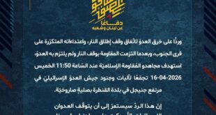 بِسْمِ اللَّـهِ الرحمن الرَّحِيمِ ﴿أُذِنَ لِلَّذِينَ يُقَاتَلُونَ بِأَنَّهُمْ ظُلِمُوا وَإِنَّ اللَّهَ عَلَىٰ نَصْرِهِمْ لَقَدِيرٌ﴾ صَدَقَ اللهُ العَلِيّ العَظِيم دفاعًا عن لبنان وشعبه، وردًّا على خرق العدوّ لاتفاق وقف إطلاق النار، واعتداءاته المتكرّرة على قرى ومدن الجنوب، وبعدما التزمت المقاومة بوقف النار ولم يلتزم به العدوّ، استهدف مجاهدو المُقاومة الإسلاميّة عند السّاعة 13:15 الخميس 16-04-2026 مستوطنة نهاريّا بصليةٍ صاروخيّة. إنّ هذا …