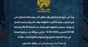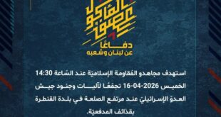 بِسْمِ اللَّـهِ الرحمن الرَّحِيمِ ﴿أُذِنَ لِلَّذِينَ يُقَاتَلُونَ بِأَنَّهُمْ ظُلِمُوا وَإِنَّ اللَّهَ عَلَىٰ نَصْرِهِمْ لَقَدِيرٌ﴾ صَدَقَ اللهُ العَلِيّ العَظِيم دفاعًا عن لبنان وشعبه، وردًّا على خرق العدوّ لاتفاق وقف إطلاق النار، واعتداءاته المتكرّرة على قرى ومدن الجنوب، وبعدما التزمت المقاومة بوقف النار ولم يلتزم به العدوّ، استهدف مجاهدو المُقاومة الإسلاميّة عند السّاعة 06:45 والسّاعة 07:00 الخميس 16-04-2026 دبّابتَي ميركافا عند مرتفع …