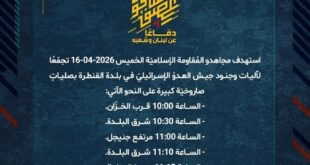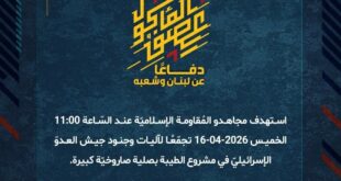 بِسْمِ اللَّـهِ الرحمن الرَّحِيمِ ﴿أُذِنَ لِلَّذِينَ يُقَاتَلُونَ بِأَنَّهُمْ ظُلِمُوا وَإِنَّ اللَّهَ عَلَىٰ نَصْرِهِمْ لَقَدِيرٌ﴾ صَدَقَ اللهُ العَلِيّ العَظِيم دفاعًا عن لبنان وشعبه، استهدف مجاهدو المُقاومة الإسلاميّة الخميس 16-04-2026 تجمّعًا لآليات وجنود جيش العدوّ الإسرائيليّ في بلدة القنطرة بصلياتٍ صاروخيّة كبيرة على النحو الآتي: – الساعة 10:00 قرب الخزّان. – الساعة 10:30 شرق البلدة. – الساعة 11:00 مرتفع جنيجل. – الساعة …
