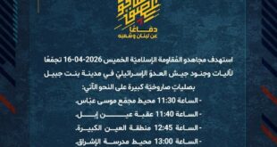 بِسْمِ اللَّـهِ الرحمن الرَّحِيمِ ﴿أُذِنَ لِلَّذِينَ يُقَاتَلُونَ بِأَنَّهُمْ ظُلِمُوا وَإِنَّ اللَّهَ عَلَىٰ نَصْرِهِمْ لَقَدِيرٌ﴾ صَدَقَ اللهُ العَلِيّ العَظِيم دفاعًا عن لبنان وشعبه، استهدف مجاهدو المُقاومة الإسلاميّة الخميس 16-04-2026 تجمّعًا لآليات وجنود جيش العدوّ الإسرائيليّ في مدينة بنت جبيل بصلياتٍ صاروخيّة كبيرة على النحو الآتي: – الساعة 11:30 محيط مجمّع موسى عبّاس. – الساعة 11:40 عقبة عين إبل. – الساعة 12:45 …