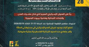 بِسْمِ اللَّـهِ الرحمن الرَّحِيمِ ﴿أُذِنَ لِلَّذِينَ يُقَاتَلُونَ بِأَنَّهُمْ ظُلِمُوا وَإِنَّ اللَّهَ عَلَىٰ نَصْرِهِمْ لَقَدِيرٌ الَّذِينَ أُخْرِجُوا مِن دِيَارِهِم بِغَيْرِ حَقٍّ إِلَّا أَن يَقُولُوا رَبُّنَا اللَّهُ﴾ صَدَقَ اللهُ العَلِيّ العَظِيم ردًّا على العدوان الإسرائيلي المجرم الذي طال عشرات المدن والبلدات اللبنانيّة بما فيها ضاحية بيروت الجنوبيّة، استهدف مجاهدو المقاومة الإسلامية عند الساعة 16:18 أمس الثلاثاء 10/03/2026 تجمّعًا لقوّات جيش العدو الإسرائيلي …