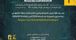 بِسْمِ اللَّـهِ الرحمن الرَّحِيمِ ﴿أُذِنَ لِلَّذِينَ يُقَاتَلُونَ بِأَنَّهُمْ ظُلِمُوا وَإِنَّ اللَّهَ عَلَىٰ نَصْرِهِمْ لَقَدِيرٌ الَّذِينَ أُخْرِجُوا مِن دِيَارِهِم بِغَيْرِ حَقٍّ إِلَّا أَن يَقُولُوا رَبُّنَا اللَّهُ﴾ صَدَقَ اللهُ العَلِيّ العَظِيم بعد رصد قوّة لجيش العدوّ الإسرائيليّ تتقدّم باتّجاه منطقة الخانوق في بلدة عيترون الحدوديّة، عند الساعة 23:30 أمس الثلاثاء 10/03/2026، استهدفها مجاهدو المُقاومة الإسلاميّة بصليات صاروخيّة. ﴿وَمَا النَّصْرُ إِلاَّ مِنْ عِندِ …