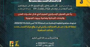 بِسْمِ اللَّـهِ الرحمن الرَّحِيمِ ﴿أُذِنَ لِلَّذِينَ يُقَاتَلُونَ بِأَنَّهُمْ ظُلِمُوا وَإِنَّ اللَّهَ عَلَىٰ نَصْرِهِمْ لَقَدِيرٌ الَّذِينَ أُخْرِجُوا مِن دِيَارِهِم بِغَيْرِ حَقٍّ إِلَّا أَن يَقُولُوا رَبُّنَا اللَّهُ﴾ صَدَقَ اللهُ العَلِيّ العَظِيم ردًّا على العدوان الإسرائيلي المجرم الذي طال عشرات المدن والبلدات اللبنانيّة بما فيها ضاحية بيروت الجنوبيّة، استهدف مجاهدو المقاومة الإسلامية عند الساعة 02:20 فجر اليوم الأربعاء 11/03/2026 تجمّعًا لقوّات جيش العدو …