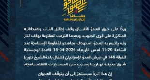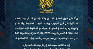 بِسْمِ اللَّـهِ الرحمن الرَّحِيمِ ﴿أُذِنَ لِلَّذِينَ يُقَاتَلُونَ بِأَنَّهُمْ ظُلِمُوا وَإِنَّ اللَّهَ عَلَىٰ نَصْرِهِمْ لَقَدِيرٌ﴾ صَدَقَ اللهُ العَلِيّ العَظِيم دفاعًا عن لبنان وشعبه، وردًّا على خرق العدوّ لاتّفاق وقف إطلاق النار، واعتداءاته المتكرّرة على قرى الجنوب، وبعدما التزمت المقاومة بوقف النار ولم يلتزم به العدوّ، استهدف مجاهدو المُقاومة الإسلاميّة عند السّاعة 14:30 أمس الأربعاء 15-04-2026 مقر قيادة الفرقة 146 في مستوطنة …