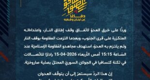 بِسْمِ اللَّـهِ الرحمن الرَّحِيمِ ﴿أُذِنَ لِلَّذِينَ يُقَاتَلُونَ بِأَنَّهُمْ ظُلِمُوا وَإِنَّ اللَّهَ عَلَىٰ نَصْرِهِمْ لَقَدِيرٌ﴾ صَدَقَ اللهُ العَلِيّ العَظِيم دفاعًا عن لبنان وشعبه، وردًّا على خرق العدوّ لاتفاق وقف إطلاق النار، واعتداءاته المتكرّرة على قرى الجنوب، وبعدما التزمت المقاومة بوقف النار ولم يلتزم به العدوّ، استهدف مجاهدو المُقاومة الإسلاميّة عند السّاعة 15:15 أمس الأربعاء 15-04-2026 رادارًا للاتّصالات في ثكنة كتسافيا في …