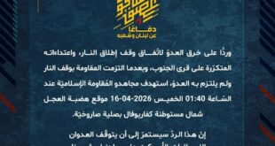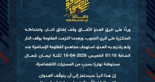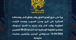 بِسْمِ اللَّـهِ الرحمن الرَّحِيمِ ﴿أُذِنَ لِلَّذِينَ يُقَاتَلُونَ بِأَنَّهُمْ ظُلِمُوا وَإِنَّ اللَّهَ عَلَىٰ نَصْرِهِمْ لَقَدِيرٌ﴾ صَدَقَ اللهُ العَلِيّ العَظِيم دفاعًا عن لبنان وشعبه، وردًّا على خرق العدوّ لاتفاق وقف إطلاق النار، واعتداءاته المتكرّرة على قرى الجنوب، وبعدما التزمت المقاومة بوقف النار ولم يلتزم به العدوّ، استهدف مجاهدو المُقاومة الإسلاميّة عند السّاعة 01:10 الخميس 16-04-2026 ثكنة ليمان شمال مستوطنة نهاريّا بسربٍ من …