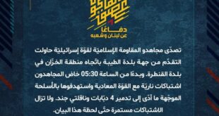 بِسْمِ اللَّـهِ الرحمن الرَّحِيمِ ﴿أُذِنَ لِلَّذِينَ يُقَاتَلُونَ بِأَنَّهُمْ ظُلِمُوا وَإِنَّ اللَّهَ عَلَىٰ نَصْرِهِمْ لَقَدِيرٌ﴾ صَدَقَ اللهُ العَلِيّ العَظِيم دفاعًا عن لبنان وشعبه، تصدّى مجاهدو المقاومة الإسلاميّة لقوّة إسرائيليّة حاولت التقدّم من جهة بلدة الطيبة باتّجاه منطقة الخزّان في بلدة القنطرة. وبدءًا من الساعة 05:30 خاض المجاهدون اشتباكات ناريّة مع القوّة المعادية واستهدفوها بالأسلحة الموجّهة ما أدّى إلى تدمير 4 دبّابات …