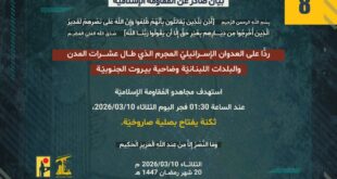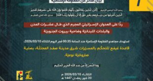 بِسْمِ اللَّـهِ الرحمن الرَّحِيمِ ﴿أُذِنَ لِلَّذِينَ يُقَاتَلُونَ بِأَنَّهُمْ ظُلِمُوا وَإِنَّ اللَّهَ عَلَىٰ نَصْرِهِمْ لَقَدِيرٌ الَّذِينَ أُخْرِجُوا مِن دِيَارِهِم بِغَيْرِ حَقٍّ إِلَّا أَن يَقُولُوا رَبُّنَا اللَّهُ﴾ صَدَقَ اللهُ العَلِيّ العَظِيم ردًّا على العدوان الإسرائيليّ المجرم الذي طال عشرات المدن والبلدات اللبنانيّة وضاحية بيروت الجنوبيّة، استهدف مجاهدو المُقاومة الإسلاميّة عند الساعة 01:30 فجر اليوم الثلاثاء 10/03/2026 ثكنة يفتاح بصلية صاروخيّة. ﴿وَمَا النَّصْرُ …