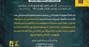 بِسْمِ اللَّـهِ الرحمن الرَّحِيمِ ﴿أُذِنَ لِلَّذِينَ يُقَاتَلُونَ بِأَنَّهُمْ ظُلِمُوا وَإِنَّ اللَّهَ عَلَىٰ نَصْرِهِمْ لَقَدِيرٌ الَّذِينَ أُخْرِجُوا مِن دِيَارِهِم بِغَيْرِ حَقٍّ إِلَّا أَن يَقُولُوا رَبُّنَا اللَّهُ﴾ صَدَقَ اللهُ العَلِيّ العَظِيم ردًّا على العدوان الإسرائيليّ المجرم الذي طال عشرات المدن والبلدات اللبنانيّة وضاحية بيروت الجنوبيّة، استهدف مجاهدو المُقاومة الإسلاميّة عند الساعة 02:45 الثلاثاء 10/03/2026 الموقع المستحدث في تلّة الحمامص جنوب مدينة الخيام …