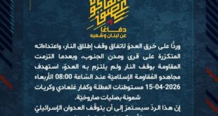 بِسْمِ اللَّـهِ الرحمن الرَّحِيمِ ﴿أُذِنَ لِلَّذِينَ يُقَاتَلُونَ بِأَنَّهُمْ ظُلِمُوا وَإِنَّ اللَّهَ عَلَىٰ نَصْرِهِمْ لَقَدِيرٌ﴾ صَدَقَ اللهُ العَلِيّ العَظِيم دفاعًا عن لبنان وشعبه، وردًّا على خرق العدوّ لاتفاق وقف إطلاق النار، واعتداءاته المتكرّرة على قرى ومدن الجنوب، وبعدما التزمت المقاومة بوقف النار ولم يلتزم به العدوّ، استهدف مجاهدو المُقاومة الإسلاميّة عند السّاعة 08:30 الأربعاء 15-04-2026 مستوطنات دوفيف، شلومي، متسوفا، يعرا، عفدون …