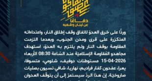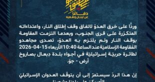 بِسْمِ اللَّـهِ الرحمن الرَّحِيمِ ﴿أُذِنَ لِلَّذِينَ يُقَاتَلُونَ بِأَنَّهُمْ ظُلِمُوا وَإِنَّ اللَّهَ عَلَىٰ نَصْرِهِمْ لَقَدِيرٌ﴾ صَدَقَ اللهُ العَلِيّ العَظِيم دفاعًا عن لبنان وشعبه، وردًّا على خرق العدوّ لاتفاق وقف إطلاق النار، واعتداءاته المتكرّرة على قرى الجنوب، وبعدما التزمت المقاومة بوقف النار ولم يلتزم به العدوّ، تصدى مجاهدو المُقاومة الإسلاميّة عند الساعة 10:40 الأربعاء 15-04-2026 لطائرة حربيّة إسرائيليّة في أجواء بلدة دِبعال …