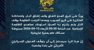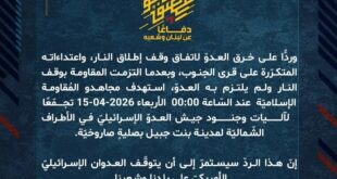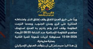 بِسْمِ اللَّـهِ الرحمن الرَّحِيمِ ﴿أُذِنَ لِلَّذِينَ يُقَاتَلُونَ بِأَنَّهُمْ ظُلِمُوا وَإِنَّ اللَّهَ عَلَىٰ نَصْرِهِمْ لَقَدِيرٌ﴾ صَدَقَ اللهُ العَلِيّ العَظِيم دفاعًا عن لبنان وشعبه، وردًّا على خرق العدوّ لاتفاق وقف إطلاق النار، واعتداءاته المتكرّرة على قرى ومدن الجنوب، وبعدما التزمت المقاومة بوقف النار ولم يلتزم به العدوّ، استهدف مجاهدو المُقاومة الإسلاميّة عند السّاعة 08:55 الأربعاء 15-04-2026 مستوطنة كريات شمونة للمرة الثانية بصلية …
