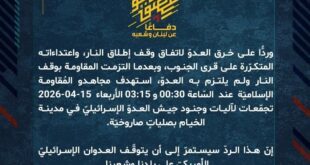 بِسْمِ اللَّـهِ الرحمن الرَّحِيمِ ﴿أُذِنَ لِلَّذِينَ يُقَاتَلُونَ بِأَنَّهُمْ ظُلِمُوا وَإِنَّ اللَّهَ عَلَىٰ نَصْرِهِمْ لَقَدِيرٌ﴾ صَدَقَ اللهُ العَلِيّ العَظِيم دفاعًا عن لبنان وشعبه، وردًّا على خرق العدوّ لاتفاق وقف إطلاق النار، واعتداءاته المتكرّرة على قرى الجنوب، وبعدما التزمت المقاومة بوقف النار ولم يلتزم به العدوّ، استهدف مجاهدو المُقاومة الإسلاميّة عند السّاعة 00:30 و 03:15 الأربعاء 15-04-2026 تجمّعات لآليات وجنود جيش العدوّ …