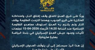 بِسْمِ اللَّـهِ الرحمن الرَّحِيمِ ﴿أُذِنَ لِلَّذِينَ يُقَاتَلُونَ بِأَنَّهُمْ ظُلِمُوا وَإِنَّ اللَّهَ عَلَىٰ نَصْرِهِمْ لَقَدِيرٌ﴾ صَدَقَ اللهُ العَلِيّ العَظِيم دفاعًا عن لبنان وشعبه، وردًّا على خرق العدوّ لاتفاق وقف إطلاق النار، واعتداءاته المتكرّرة على قرى الجنوب، وبعدما التزمت المقاومة بوقف النار ولم يلتزم به العدوّ، استهدف مجاهدو المُقاومة الإسلاميّة عند السّاعة 09:30 الأربعاء 15-04-2026 مستوطنة مسكاف عام بصليةٍ صاروخيّة. إنّ هذا …
