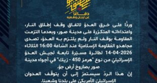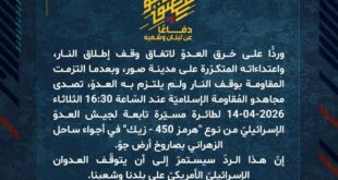 بِسْمِ اللَّـهِ الرحمن الرَّحِيمِ ﴿أُذِنَ لِلَّذِينَ يُقَاتَلُونَ بِأَنَّهُمْ ظُلِمُوا وَإِنَّ اللَّهَ عَلَىٰ نَصْرِهِمْ لَقَدِيرٌ﴾ صَدَقَ اللهُ العَلِيّ العَظِيم دفاعًا عن لبنان وشعبه، وردًّا على خرق العدوّ لاتفاق وقف إطلاق النار، واعتداءاته المتكرّرة على مدينة صور، وبعدما التزمت المقاومة بوقف النار ولم يلتزم به العدوّ، تصدى مجاهدو المُقاومة الإسلاميّة عند السّاعة 16:30 الثلاثاء 14-04-2026 لطائرة مسيّرة تابعة لجيش العدوّ الإسرائيليّ من …