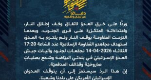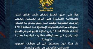 بِسْمِ اللَّـهِ الرحمن الرَّحِيمِ ﴿أُذِنَ لِلَّذِينَ يُقَاتَلُونَ بِأَنَّهُمْ ظُلِمُوا وَإِنَّ اللَّهَ عَلَىٰ نَصْرِهِمْ لَقَدِيرٌ﴾ صَدَقَ اللهُ العَلِيّ العَظِيم دفاعًا عن لبنان وشعبه، وردًّا على خرق العدوّ لاتفاق وقف إطلاق النار، واعتداءاته المتكرّرة على قرى الجنوب، وبعدما التزمت المقاومة بوقف النار ولم يلتزم به العدوّ، استهدف مجاهدو المُقاومة الإسلاميّة عند السّاعة 17:25 الثلاثاء 14-04-2026 قاعدة شراغا (المقر الإداري لقيادة لواء غولاني) …