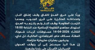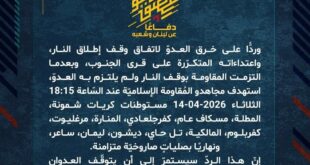 بِسْمِ اللَّـهِ الرحمن الرَّحِيمِ ﴿أُذِنَ لِلَّذِينَ يُقَاتَلُونَ بِأَنَّهُمْ ظُلِمُوا وَإِنَّ اللَّهَ عَلَىٰ نَصْرِهِمْ لَقَدِيرٌ﴾ صَدَقَ اللهُ العَلِيّ العَظِيم دفاعًا عن لبنان وشعبه، وردًّا على خرق العدوّ لاتفاق وقف إطلاق النار، واعتداءاته المتكرّرة على قرى الجنوب، وبعدما التزمت المقاومة بوقف النار ولم يلتزم به العدوّ، استهدف مجاهدو المُقاومة الإسلاميّة عند السّاعة 17:30 الثلاثاء 14-04-2026 مستوطنة نهاريّا بصلية صاروخيّة. إنّ هذا الردّ …