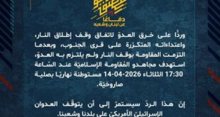 بِسْمِ اللَّـهِ الرحمن الرَّحِيمِ ﴿أُذِنَ لِلَّذِينَ يُقَاتَلُونَ بِأَنَّهُمْ ظُلِمُوا وَإِنَّ اللَّهَ عَلَىٰ نَصْرِهِمْ لَقَدِيرٌ﴾ صَدَقَ اللهُ العَلِيّ العَظِيم دفاعًا عن لبنان وشعبه، وردًّا على خرق العدوّ لاتفاق وقف إطلاق النار، واعتداءاته المتكرّرة على قرى الجنوب، وبعدما التزمت المقاومة بوقف النار ولم يلتزم به العدوّ، استهدف مجاهدو المُقاومة الإسلاميّة عند السّاعة 17:15 الثلاثاء 14-04-2026 بنى تحتيّة تتبع لجيش العدوّ الإسرائيليّ في …