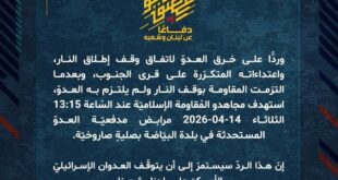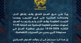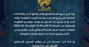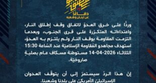 بِسْمِ اللَّـهِ الرحمن الرَّحِيمِ ﴿أُذِنَ لِلَّذِينَ يُقَاتَلُونَ بِأَنَّهُمْ ظُلِمُوا وَإِنَّ اللَّهَ عَلَىٰ نَصْرِهِمْ لَقَدِيرٌ﴾ صَدَقَ اللهُ العَلِيّ العَظِيم دفاعًا عن لبنان وشعبه، وردًّا على خرق العدوّ لاتفاق وقف إطلاق النار، واعتداءاته المتكرّرة على قرى الجنوب، وبعدما التزمت المقاومة بوقف النار ولم يلتزم به العدوّ، استهدف مجاهدو المُقاومة الإسلاميّة عند السّاعة 15:15 الثلاثاء 14-04-2026 مستوطنة كريات شمونة بصليةٍ صاروخيّة. إنّ هذا …