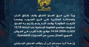 بِسْمِ اللَّـهِ الرحمن الرَّحِيمِ ﴿أُذِنَ لِلَّذِينَ يُقَاتَلُونَ بِأَنَّهُمْ ظُلِمُوا وَإِنَّ اللَّهَ عَلَىٰ نَصْرِهِمْ لَقَدِيرٌ﴾ صَدَقَ اللهُ العَلِيّ العَظِيم دفاعًا عن لبنان وشعبه، وردًّا على خرق العدوّ لاتفاق وقف إطلاق النار، واعتداءاته المتكرّرة على قرى الجنوب، وبعدما التزمت المقاومة بوقف النار ولم يلتزم به العدوّ، استهدف مجاهدو المُقاومة الإسلاميّة عند السّاعة 12:10 الثلاثاء 14-04-2026 موقع نافه أطيب في الجولان السوري المحتلّ …