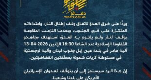بِسْمِ اللَّـهِ الرحمن الرَّحِيمِ ﴿أُذِنَ لِلَّذِينَ يُقَاتَلُونَ بِأَنَّهُمْ ظُلِمُوا وَإِنَّ اللَّهَ عَلَىٰ نَصْرِهِمْ لَقَدِيرٌ﴾ صَدَقَ اللهُ العَلِيّ العَظِيم دفاعًا عن لبنان وشعبه، وردًّا على خرق العدوّ لاتفاق وقف إطلاق النار، واعتداءاته المتكرّرة على قرى الجنوب، وبعدما التزمت المقاومة بوقف النار ولم يلتزم به العدوّ، استهدف مجاهدو المُقاومة الإسلاميّة عند السّاعة 16:30 الإثنين 13-04-2026 آلية هامر في بلدة عين إبل جنوب …