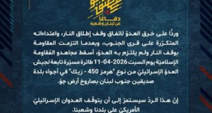 بِسْمِ اللَّـهِ الرحمن الرَّحِيمِ ﴿أُذِنَ لِلَّذِينَ يُقَاتَلُونَ بِأَنَّهُمْ ظُلِمُوا وَإِنَّ اللَّهَ عَلَىٰ نَصْرِهِمْ لَقَدِيرٌ﴾ صَدَقَ اللهُ العَلِيّ العَظِيم دفاعًا عن لبنان وشعبه، وردًّا على خرق العدوّ لاتفاق وقف إطلاق النار، واعتداءاته المتكرّرة على قرى الجنوب، وبعدما التزمت المقاومة بوقف النار ولم يلتزم به العدوّ، أسقط مجاهدو المُقاومة الإسلاميّة يوم السبت 11-04-2026 طائرة مسيّرة تابعة لجيش العدوّ الإسرائيليّ من نوع “هرمز …