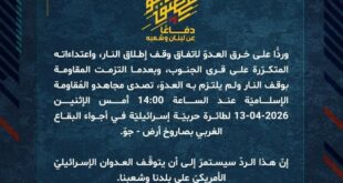 بِسْمِ اللَّـهِ الرحمن الرَّحِيمِ ﴿أُذِنَ لِلَّذِينَ يُقَاتَلُونَ بِأَنَّهُمْ ظُلِمُوا وَإِنَّ اللَّهَ عَلَىٰ نَصْرِهِمْ لَقَدِيرٌ﴾ صَدَقَ اللهُ العَلِيّ العَظِيم دفاعًا عن لبنان وشعبه، وردًّا على خرق العدوّ لاتفاق وقف إطلاق النار، واعتداءاته المتكرّرة على قرى الجنوب، وبعدما التزمت المقاومة بوقف النار ولم يلتزم به العدوّ، تصدى مجاهدو المُقاومة الإسلاميّة عند الساعة 14:00 أمس الإثنين 13-04-2026 لطائرة حربيّة إسرائيليّة في أجواء البقاع …