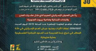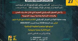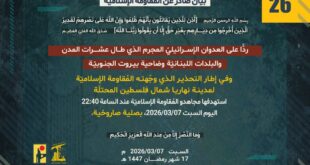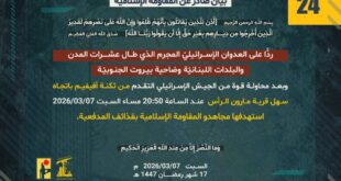 بِسْمِ اللَّـهِ الرحمن الرَّحِيمِ ﴿أُذِنَ لِلَّذِينَ يُقَاتَلُونَ بِأَنَّهُمْ ظُلِمُوا وَإِنَّ اللَّهَ عَلَىٰ نَصْرِهِمْ لَقَدِيرٌ الَّذِينَ أُخْرِجُوا مِن دِيَارِهِم بِغَيْرِ حَقٍّ إِلَّا أَن يَقُولُوا رَبُّنَا اللَّهُ﴾ صَدَقَ اللهُ العَلِيّ العَظِيم ردًّا على العدوان الإسرائيلي المجرم الذي طال عشرات المدن والبلدات اللبنانيّة بما فيها ضاحية بيروت الجنوبيّة، استهدف مجاهدو المقاومة الإسلاميّة عند الساعة 21:45 من ليل اليوم السبت 07/03/2026 تجمّعًا لقوّات جيش …