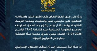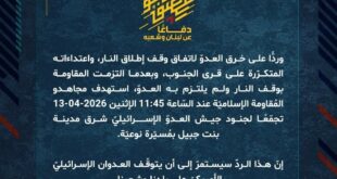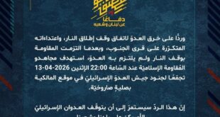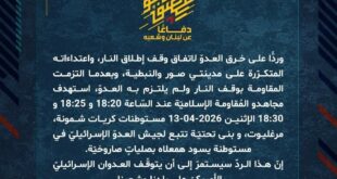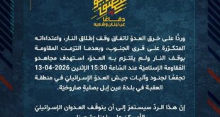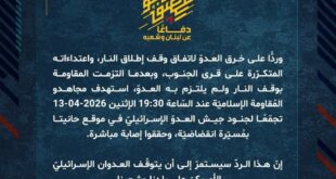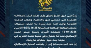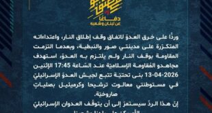 بِسْمِ اللَّـهِ الرحمن الرَّحِيمِ ﴿أُذِنَ لِلَّذِينَ يُقَاتَلُونَ بِأَنَّهُمْ ظُلِمُوا وَإِنَّ اللَّهَ عَلَىٰ نَصْرِهِمْ لَقَدِيرٌ﴾ صَدَقَ اللهُ العَلِيّ العَظِيم دفاعًا عن لبنان وشعبه، وردًّا على خرق العدوّ لاتفاق وقف إطلاق النار، واعتداءاته المتكرّرة على مدينتي صور والنبطية، وبعدما التزمت المقاومة بوقف النار ولم يلتزم به العدوّ، استهدف مجاهدو المُقاومة الإسلاميّة عند السّاعة 17:45 الإثنين 13-04-2026 قاعدة تيفن شرق مدينة عكّا المحتلّة …