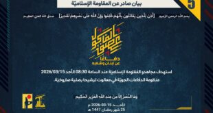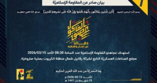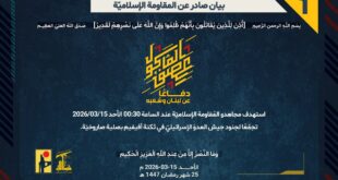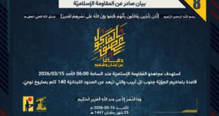 بِسْمِ اللَّـهِ الرحمن الرَّحِيمِ ﴿أُذِنَ لِلَّذِينَ يُقَاتَلُونَ بِأَنَّهُمْ ظُلِمُوا وَإِنَّ اللَّهَ عَلَىٰ نَصْرِهِمْ لَقَدِيرٌ﴾ صَدَقَ اللهُ العَلِيّ العَظِيم دفاعًا عن لبنان وشعبه، استهدف مجاهدو المُقاومة الإسلاميّة عند الساعة 03:45 الأحد 15/03/2026بيان صادر عن المقاومة الإسلامية (4): تجمّعًا لجنود جيش العدوّ الإسرائيليّ عند نقطة جيبيا مقابل بلدة ميس الجبل الحدوديّة بقذائف المدفعيّة. ﴿وَمَا النَّصْرُ إِلاَّ مِنْ عِندِ اللّهِ الْعَزِيزِ الْحَكِيم﴾ الأحد …
