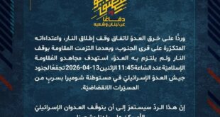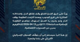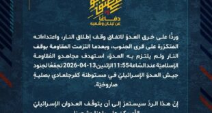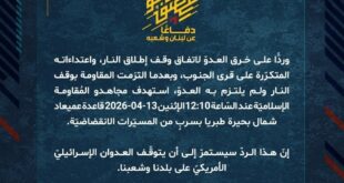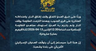 بِسْمِ اللَّـهِ الرحمن الرَّحِيمِ ﴿أُذِنَ لِلَّذِينَ يُقَاتَلُونَ بِأَنَّهُمْ ظُلِمُوا وَإِنَّ اللَّهَ عَلَىٰ نَصْرِهِمْ لَقَدِيرٌ﴾ صَدَقَ اللهُ العَلِيّ العَظِيم دفاعًا عن لبنان وشعبه، وردًّا على خرق العدوّ لاتفاق وقف إطلاق النار، واعتداءاته المتكرّرة على قرى الجنوب، وبعدما التزمت المقاومة بوقف النار ولم يلتزم به العدوّ، استهدف مجاهدو المُقاومة الإسلاميّة عند السّاعة 12:30 الإثنين 13-04-2026 ثكنة أفيفيم بصليةٍ صاروخيّة. إنّ هذا الردّ …