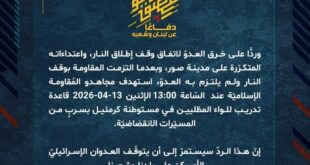 بِسْمِ اللَّـهِ الرحمن الرَّحِيمِ ﴿أُذِنَ لِلَّذِينَ يُقَاتَلُونَ بِأَنَّهُمْ ظُلِمُوا وَإِنَّ اللَّهَ عَلَىٰ نَصْرِهِمْ لَقَدِيرٌ﴾ صَدَقَ اللهُ العَلِيّ العَظِيم دفاعًا عن لبنان وشعبه، وردًّا على خرق العدوّ لاتفاق وقف إطلاق النار، واعتداءاته المتكرّرة على مدينة صور، وبعدما التزمت المقاومة بوقف النار ولم يلتزم به العدوّ، استهدف مجاهدو المُقاومة الإسلاميّة عند السّاعة 13:00 الإثنين 13-04-2026 قاعدة تدريب للواء المظليين في مستوطنة كرمئيل …