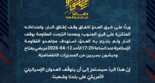 بِسْمِ اللَّـهِ الرحمن الرَّحِيمِ ﴿أُذِنَ لِلَّذِينَ يُقَاتَلُونَ بِأَنَّهُمْ ظُلِمُوا وَإِنَّ اللَّهَ عَلَىٰ نَصْرِهِمْ لَقَدِيرٌ﴾ صَدَقَ اللهُ العَلِيّ العَظِيم دفاعًا عن لبنان وشعبه، وردًّا على خرق العدوّ لاتفاق وقف إطلاق النار، واعتداءاته المتكرّرة على قرى الجنوب، وبعدما التزمت المقاومة بوقف النار ولم يلتزم به العدوّ، استهدف مجاهدو المُقاومة الإسلاميّة عند السّاعة 17:20 الأحد 2026-04-12 مربضي يفتاح وديشون بسِربين من المسيّرات الانقضاضيّة. …