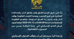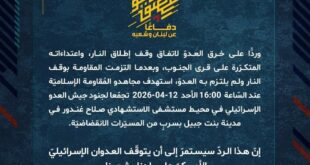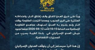 بِسْمِ اللَّـهِ الرحمن الرَّحِيمِ ﴿أُذِنَ لِلَّذِينَ يُقَاتَلُونَ بِأَنَّهُمْ ظُلِمُوا وَإِنَّ اللَّهَ عَلَىٰ نَصْرِهِمْ لَقَدِيرٌ﴾ صَدَقَ اللهُ العَلِيّ العَظِيم دفاعًا عن لبنان وشعبه، وردًّا على خرق العدوّ لاتفاق وقف إطلاق النار، واعتداءاته المتكرّرة على قرى الجنوب، وبعدما التزمت المقاومة بوقف النار ولم يلتزم به العدوّ، استهدف مجاهدو المُقاومة الإسلاميّة عند السّاعة 16:00 الأحد 12-04-2026 تجمّعا لجنود جيش العدو الإسرائيلي في محيط …