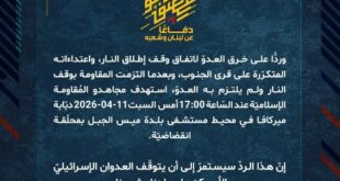 بِسْمِ اللَّـهِ الرحمن الرَّحِيمِ ﴿أُذِنَ لِلَّذِينَ يُقَاتَلُونَ بِأَنَّهُمْ ظُلِمُوا وَإِنَّ اللَّهَ عَلَىٰ نَصْرِهِمْ لَقَدِيرٌ﴾ صَدَقَ اللهُ العَلِيّ العَظِيم دفاعًا عن لبنان وشعبه، وردًّا على خرق العدوّ لاتفاق وقف إطلاق النار، واعتداءاته المتكرّرة على قرى الجنوب، وبعدما التزمت المقاومة بوقف النار ولم يلتزم به العدوّ، استهدف مجاهدو المُقاومة الإسلاميّة عند السّاعة 17:00 أمس السبت 11-04-2026 دبّابة ميركافا في محيط مستشفى بلدة …