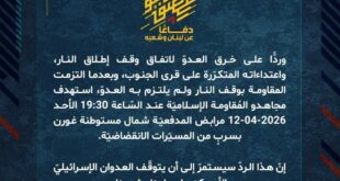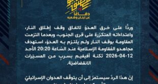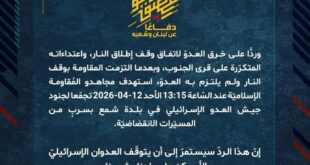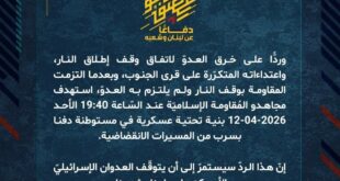 بِسْمِ اللَّـهِ الرحمن الرَّحِيمِ ﴿أُذِنَ لِلَّذِينَ يُقَاتَلُونَ بِأَنَّهُمْ ظُلِمُوا وَإِنَّ اللَّهَ عَلَىٰ نَصْرِهِمْ لَقَدِيرٌ﴾ صَدَقَ اللهُ العَلِيّ العَظِيم دفاعًا عن لبنان وشعبه، وردًّا على خرق العدوّ لاتفاق وقف إطلاق النار، واعتداءاته المتكرّرة على قرى الجنوب، وبعدما التزمت المقاومة بوقف النار ولم يلتزم به العدوّ، استهدف مجاهدو المُقاومة الإسلاميّة عند السّاعة 19:15 الأحد 12-04-2026 مستوطنة نهاريا بصليةٍ صاروخيّة. إنّ هذا الردّ …