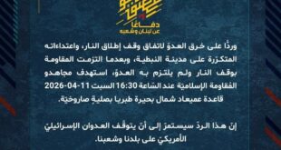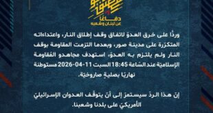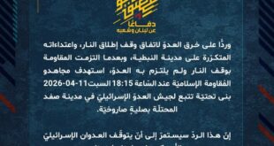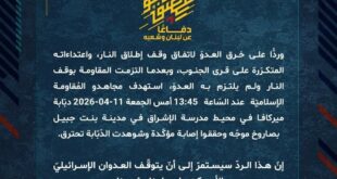 بِسْمِ اللَّـهِ الرحمن الرَّحِيمِ ﴿أُذِنَ لِلَّذِينَ يُقَاتَلُونَ بِأَنَّهُمْ ظُلِمُوا وَإِنَّ اللَّهَ عَلَىٰ نَصْرِهِمْ لَقَدِيرٌ﴾ صَدَقَ اللهُ العَلِيّ العَظِيم دفاعًا عن لبنان وشعبه، وردًّا على خرق العدوّ لاتفاق وقف إطلاق النار، واعتداءاته المتكرّرة على قرى الجنوب، وبعدما التزمت المقاومة بوقف النار ولم يلتزم به العدوّ، استهدف مجاهدو المُقاومة الإسلاميّة عند السّاعة 19:30 السبت 11-04-2026 مستوطنة يرؤون بصليةٍ صاروخيّة. إنّ هذا الردّ …