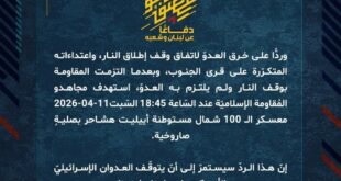 بِسْمِ اللَّـهِ الرحمن الرَّحِيمِ ﴿أُذِنَ لِلَّذِينَ يُقَاتَلُونَ بِأَنَّهُمْ ظُلِمُوا وَإِنَّ اللَّهَ عَلَىٰ نَصْرِهِمْ لَقَدِيرٌ﴾ صَدَقَ اللهُ العَلِيّ العَظِيم دفاعًا عن لبنان وشعبه، وردًّا على خرق العدوّ لاتفاق وقف إطلاق النار، واعتداءاته المتكرّرة على قرى الجنوب، وبعدما التزمت المقاومة بوقف النار ولم يلتزم به العدوّ، استهدف مجاهدو المُقاومة الإسلاميّة عند السّاعة 18:45 السّبت 11-04-2026 معسكر الـ 100 شمال مستوطنة أييليت هشاحر …