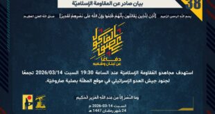 بِسْمِ اللَّـهِ الرحمن الرَّحِيمِ ﴿أُذِنَ لِلَّذِينَ يُقَاتَلُونَ بِأَنَّهُمْ ظُلِمُوا وَإِنَّ اللَّهَ عَلَىٰ نَصْرِهِمْ لَقَدِيرٌ﴾ صَدَقَ اللهُ العَلِيّ العَظِيم دفاعًا عن لبنان وشعبه، يخوض مجاهدو المُقاومة الإسلاميّة منذ الساعة 21:20 السبت 14/03/2026 اشتباكات مباشرة مع قوّات جيش العدوّ الإسرائيليّ في مدينة الخيام بالأسلحة الخفيفة والمتوسّطة والقذائف الصاروخيّة ولا تزال الاشتباكات مُستمرّة حتّى لحظة صدور هذا البيان. ﴿وَمَا النَّصْرُ إِلاَّ مِنْ عِندِ …